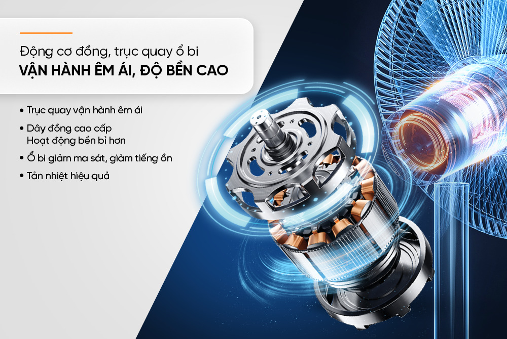 Sản phẩm sử dụng động cơ đồng kết hợp trục quay ổ bi với hiệu suất hoạt động cao, giúp máy vận hành êm ái, tiết kiệm năng lượng và tăng tuổi thọ hoạt động. Người dùng có thể yên tâm sử dụng nhiều giờ liên tục mà không lo nóng máy hay ồn ào khó chịu.
