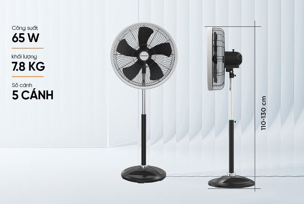 Thiết kế thân quạt đứng 5 cánh SUNHOUSE SHD7363B cho phép người dùng điều chỉnh độ cao từ 1.1m đến 1.3m dễ dàng, phù hợp với nhiều không gian sử dụng khác nhau.