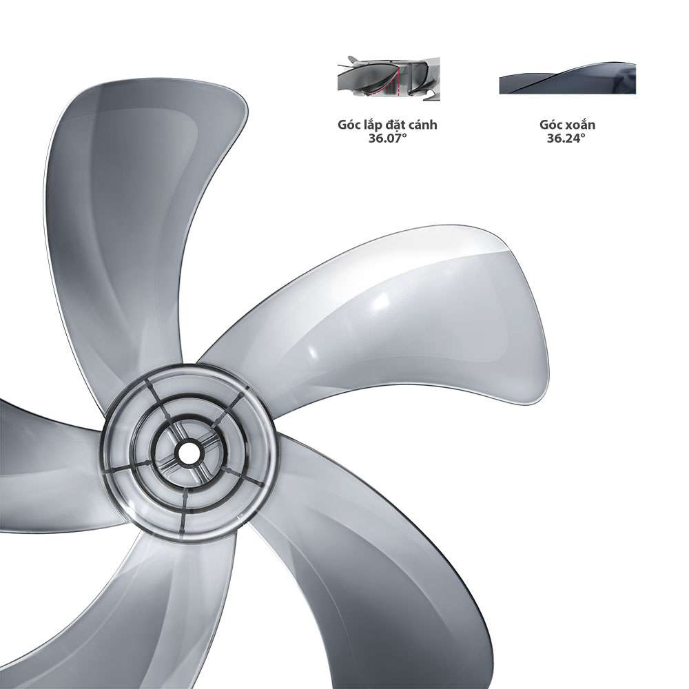 Sự kết hợp giữa góc lắp đặt cánh 36,07° và góc xoắn 36,24° giúp tăng lượng khí nạp vào và giảm tiếng ồn, đồng thời tạo ra luồng khí gấp 2,5 lần.