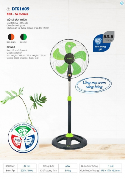 Với chế độ làm mát 3 tốc độ nhưng công suất chỉ 60W, quạt đứng DTS1609 đen cam giúp bạn tiết kiệm điện năng, bảo vệ môi trường.