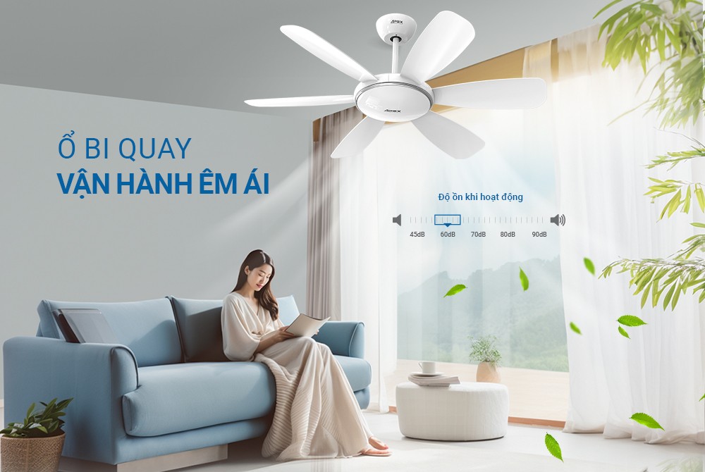 Quạt Trần Sunhouse Apex 6 Cánh Có Đèn APF7697W phù hợp trong không gian cần sự tập trung như phòng làm việc hoặc phòng ngủ bởi công năng vận hành bằng ổ bi êm ái giúp giảm thiểu độ ồn xuống ≤ 60dB, mang lại sự yên tĩnh và thoải mái cho mọi gia đình.