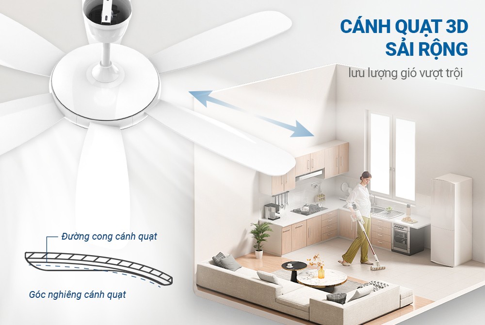 - Cánh quạt 3D, sải cánh rộng, lưu lượng gió vượt trội