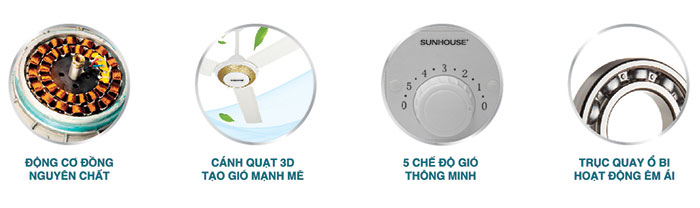 Quạt trần Sunhouse SHD7656 sử dụng động cơ bằng đồng nguyên chất siêu bền, vòng bi bôi trơn vĩnh viễn hoạt động êm ái, độ bền cao. Cánh quạt thiết kế 3D thanh thoát, màu sắc trang nhã, tinh tế, phù hợp để làm mát cho phòng khách, phòng bếp, nhà hàng, quán ăn,...