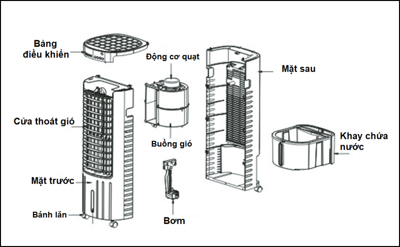 - Quạt gió: Hút không khí nóng bên ngoài khi đi qua tấm làm mát, sau đó thổi ra bên ngoài không gian luồng khí mát mẻ.