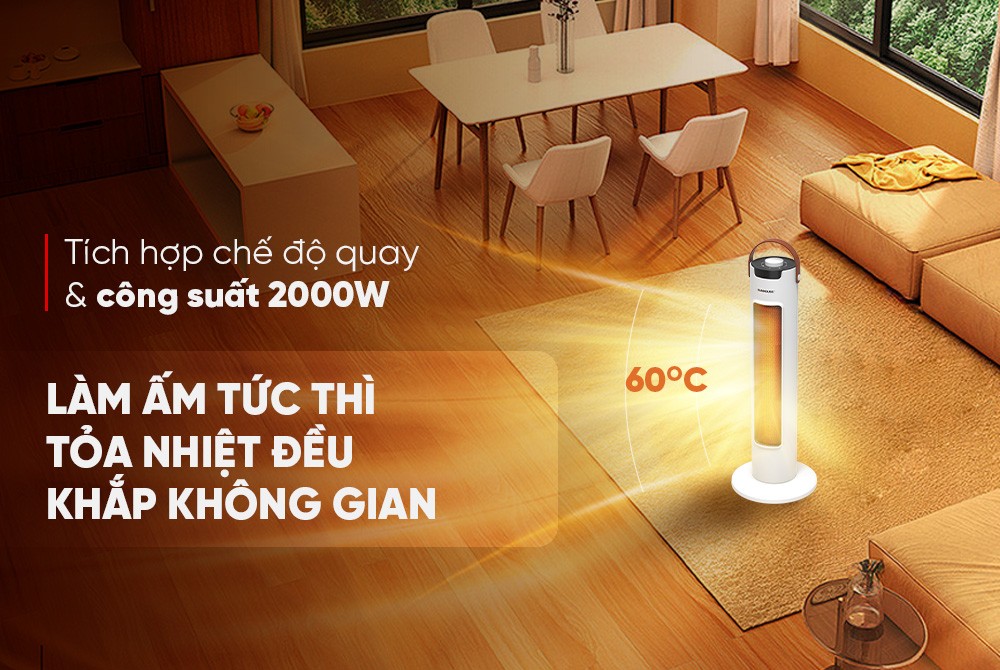 Với các chế độ sưởi như kể trên, bạn có thể yên tâm rằng chỉ ngay sau khi khởi động, sản phẩm sẽ có thể làm ấm tức thì nhờ sở hữu công suất mạnh mẽ 2000W kết hợp chế độ quay linh hoạt, giúp phân bổ hơi ấm đều khắp không gian.