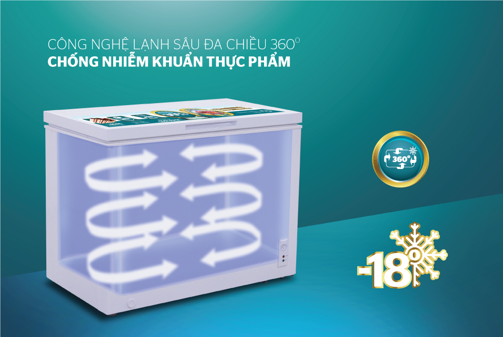 - Công nghệ lạnh sâu đa chiều 360 độ giúp hơi lạnh sâu <= -18 độ C tỏa đều khắp bên trong tủ