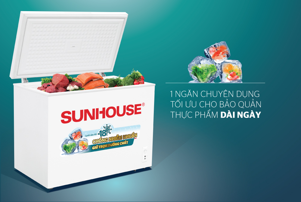 Khắc phục được vấn đề đó, công nghệ lạnh sâu đa chiều 360 độ giúp luồng khí lạnh tới <= -18 độ C tỏa đều bên trong tủ, tác động toàn diện lên bề mặt thực phẩm, đem đến hiệu quả làm lạnh sâu, đóng đông triệt để. Vì vậy, tủ đông SUNHOUSE chính là giải pháp chống nhiễm khuẩn hiệu quả, giữ trọn dưỡng chất thực phẩm.