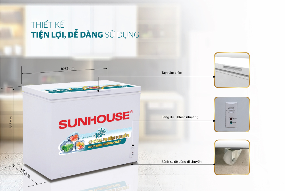 Tủ đông SUNHOUSE được tích hợp các chi tiết đem đến sự tiện lợi, thoải mái nhất cho người sử dụng, bao gồm: