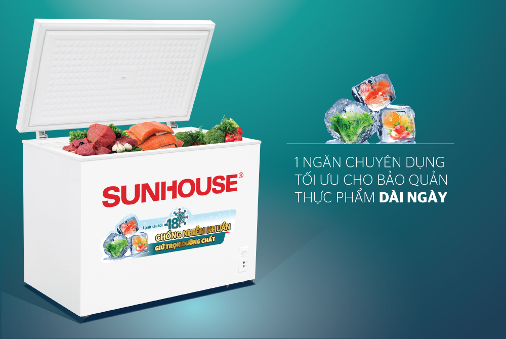 Khắc phục được vấn đề đó, công nghệ lạnh sâu đa chiều 360 độ giúp luồng khí lạnh tới <= -18 độ C tỏa đều bên trong tủ, tác động toàn diện lên bề mặt thực phẩm, đem đến hiệu quả làm lạnh sâu, đóng đông triệt để. Vì vậy, tủ đông SUNHOUSE chính là giải pháp chống nhiễm khuẩn hiệu quả, giữ trọn dưỡng chất thực phẩm.