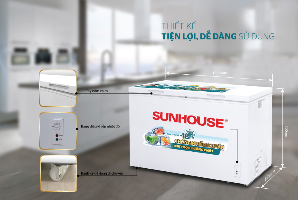 Tủ đông SUNHOUSE được tích hợp các chi tiết đem đến sự tiện lợi, thoải mái nhất cho người sử dụng, bao gồm: